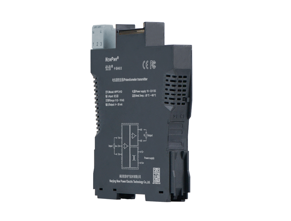 This potentiometer transmitter converts the 3-wire potentiometer signals to 4~20mA signals. It needs a backplane power supply. The input, output, and power supply are galvanically isolated from each other. Calibrate the apparatus or modify parameters by using a handheld programmer.