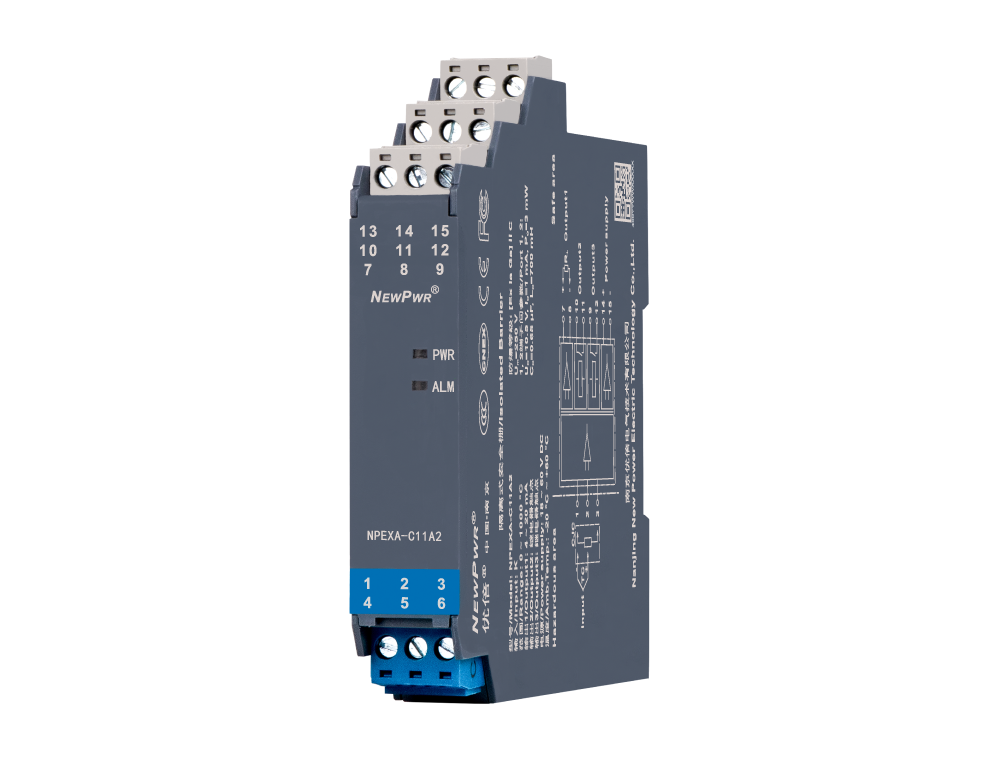 熱電偶輸入安全柵,將危險區的熱電偶信號,經隔離轉換為4~20mA電流信號輸出到安全區(其他輸出信號類型產品,具體型號見型譜),外置冷端補償端子。該產品需要獨立供電,輸入、輸出和電源三端隔離,具有在線故障自診斷功能,同時具有2路報警設定功能。可以通過PC端或手持編程器對電偶類型、溫度量程、報警方式與報警值等進行組態設置。